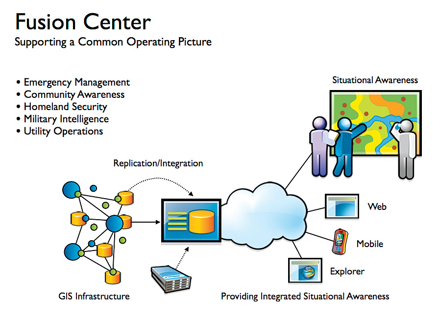 Fusion CentersThe fusion center pattern is a new type of GIS that is increasingly being implemented to provide situational awareness for organizations. In a fusion center, many GIS databases, as well as dynamic services, are brought together and integrated into a single environment that supports applications where real-time visualization of geospatial data is important (emergency response, utility operations, etc.). The fusion center pattern allows communities to interact in real time with data and services that have been encapsulated and made available for use.