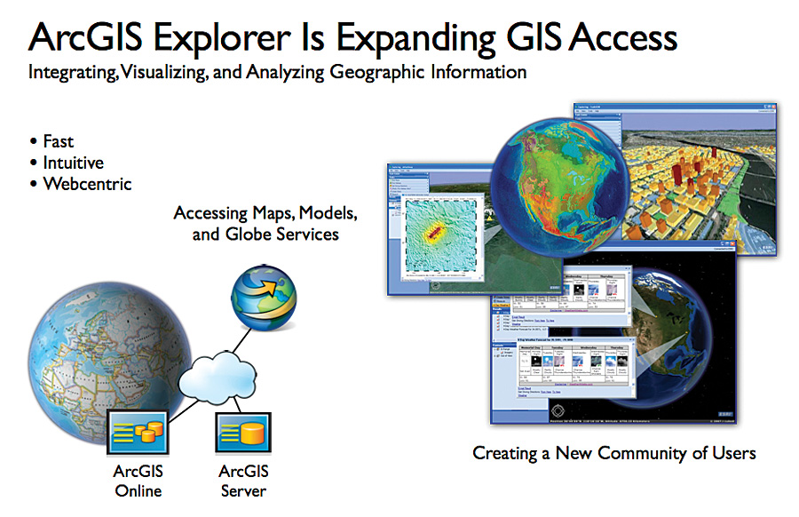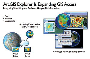 ArcGIS Explorer is a downloadable "geobrowser" that makes GIS available to everyone. This free software client provides access to advanced visualization and map services, as well as advanced spatial analysis capabilities supported by ArcGIS Server. ArcGIS Explorer has been continuously improving with rapid development cycles that deliver new features quickly. Some of the recent improvements include the ability to e-mail a result (maps or visualizations), easily print results, and hyperlink to any number of multimedia services. Esri is committed to evolving this powerful technology. In the next few months, Esri will release a new version of ArcGIS Explorer that offers integrated 2D/3D viewing and a host of new usability enhancements.