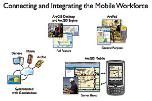 GIS is rapidly extending into the mobile environment. Esri supports three kinds of mobile applications: those based on ArcGIS Desktop and ArcGIS Engine, ArcPad, and ArcGIS Mobile. At 9.3, we released an ArcGIS Mobile application that is fully integrated with ArcGIS Server. This new application supports a server pattern that allows geoservices to be extended into the field in a rich "sometimes connected" environment. ArcGIS Mobile allows real-time data exchange that makes field-workers more efficient and connects their work in a near real-time environment, enabling more coordinated decision making.