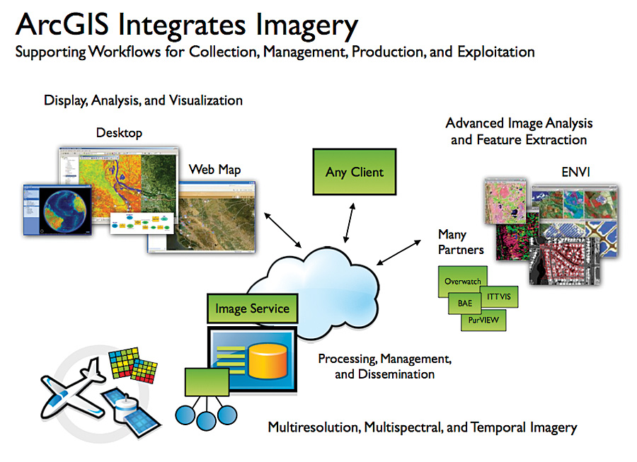 At 9.3, imagery has been integrated as a core part of ArcGIS. This includes technology enhancements that support multiple workflows associated with collection, management, production, and exploitation of imagery. Specifically, ArcGIS Server now fully integrates server-side image processing and serving. This complements a rich capability for image management and dissemination. High-performance image services support not only Esri's various clients but also virtually any image analysis and feature extraction technology. This integration means that image processing and GIS are coming together through common data management and services that support multiple environments.