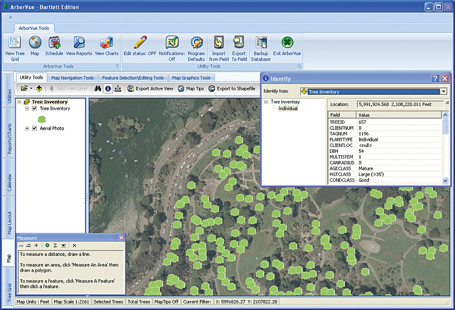 Located within the park is the San Francisco Botanical Garden at Strybing Arboretum. The garden is a 55-acre horticultural refuge where plant collections from other parts of the world, such as Chile and Australia, are cared for under the impressive canopy of pine, cypress, and gum trees. While on a walk through the garden, an anonymous donor, who used the garden as her classroom, recognized the potential risks the maturing trees posed to visitors. Many of these giants contained large dead limbs or other structural defects, which predisposed the trees to branch, stem, or root failure. Coordinating with the San Francisco Botanical Garden Society, the donor provided the funding to tackle this large problem. Bartlett Tree Experts, based in Stamford, Connecticut, with research laboratories in Charlotte, North Carolina, was called in to help remediate the probability of personal injury due to tree failure at the garden. On their initial tour of the garden, representatives from Bartlett's San Francisco office knew that hundreds of person-hours of work would be needed to complete all the required tree pruning, support system installation, and removals. To properly plan, organize, and prioritize the work, a tree inventory would need to be performed. One of Bartlett's many services is conducting GIS-based tree maintenance inventories. Bartlett staff worked with garden personnel to define the goals and objectives of an inventory of the arboretum. The focus of the inventory would be all trees 18 inches and larger in diameter at 4.5 feet above ground level or any tree that showed visual evidence that it may fail. Using ArborVue, arboriculturally focused GIS software built with ArcPad and ArcGIS Engine, not only would tree attribute information be recorded (e.g., tree species, diameter, health), but recommendations for improving tree stand health and structure (e.g., pruning, structural support system installation, or tree removal) would also be included. Furthermore, the recommendations would be prioritized with the use of a visual risk rating system while in the field. Recommendations for further tree evaluation were made for instances where it was difficult to tell from the ground whether a defect in a branch or stem warranted abatement treatment.