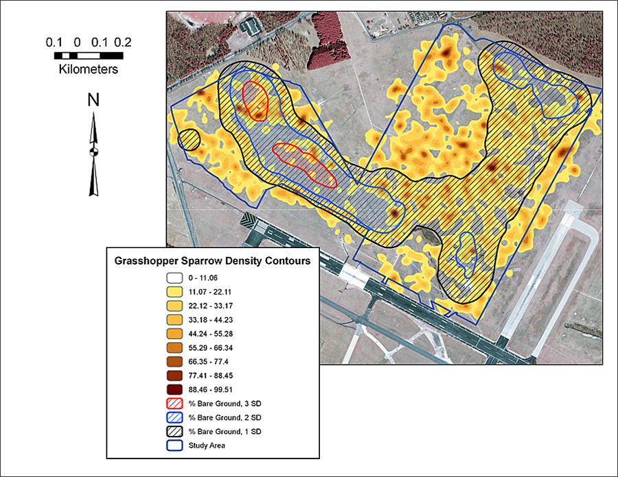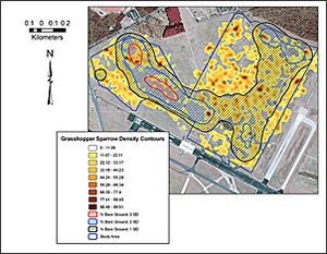 NJAS biologists involved with the ACY monitoring project have extensive experience with ArcGIS Desktop (ArcView) and ArcGIS Spatial Analyst, so use of these tools was the clear choice for conducting spatial analyses of grassland birds breeding at the airport. The spatial evaluations were geared toward six focal species, including grasshopper sparrow and upland sandpiper, and were based on two datasets generated each spring. The first consisted of point location data garnered from territory mapping efforts. Territory mapping entailed an observer recording the locations of territorial (i.e., singing) individuals on georeferenced grid maps. At each grid point, a digital range finder and compass were used to estimate the distance and direction to observed birds, thus generating a "snapshot" of bird activity on that day. Especially important were occasions of simultaneous singing by individuals close to each other, or "countersinging," and flights of birds between two locations. This data would help distinguish the boundaries of adjacent nesting territories and the spatial extent of individual habitat use. The data also could be used to highlight areas of elevated activity, or hot spots, on the study site. The second dataset consisted of basic vegetation data that was collected by PB at randomly placed sample plots around each grid point. Measurements were mainly structural and included average vegetation height, as well as percent ground cover of herbs, grass, and shrubs and percent bare ground. Back at the lab, NJAS biologists used ArcGIS Spatial Analyst to create separate density contours for each species. Contours were interpolated based on territory mapping point theme data from between 14 and 17 survey rounds combined for each breeding season. In this way, species-specific maps were generated that clearly showed areas of the GCMA where a majority of observed locations were concentrated. NJAS also used Spatial Analyst to create density contours for the vegetation data, based on average vegetation values recorded around each point. Then code was constructed to simplify the vegetation contours by converting them to polygon shapefiles depicting areas that had interpolated values that were one, two, and three standard deviations above the mean value for the study site. The biologists then overlaid these vegetation shapefiles on the density contours created for each species and examined habitat associations. Finally, based on observations of countersinging and individual movement, a polygon shapefile depicting estimated territory boundaries for each species was created. Territory centroids were identified using the field calculator in ArcView. The maps created with ArcView and ArcGIS Spatial Analyst gave NJAS a bird's-eye view of the spatial relationships between birds and vegetation at the airport. It was the first step in conducting a full spatial analysis of the site, which will examine things like habitat use versus habitat availability and changes in bird distribution over time. Ultimately, NJAS will be able to assess the effects that grassland management at airports can have on birds, so that airfield managers can make informed decisions for bird conservation, as well as airport safety. To this day, grasslands remain one of the most rapidly disappearing land-cover types in the northeastern United States. Therefore, the conservation role of airports in this ever-changing landscape is sure to increase, and the ACY project will provide extremely useful information to airport managers well into the future. More InformationFor more information, contact Dr. Kimberly Peters, director of research and monitoring, New Jersey Audubon Society (e-mail: kim.peters@njaudubon.org). |