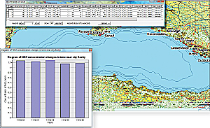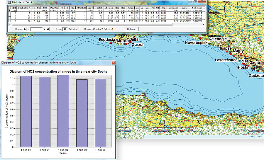 To estimate water quality, analysts compare data from observation posts with a control and calculate water characteristics using specific criteria. They can process large amounts of data to estimate when a specific observation post will exceed the maximum permissible concentrations of a pollutant. The analysts use this process to determine the changes in substance concentrations in the coastal area of the Black Sea. Values of a maximum concentration level are used as a measure of a water body's impurity. Team members charted over time the changes of substance concentration, which they used to determine when an observation site would exceed the maximum permissible value of substance concentration. The interpolated values of pollution concentration at points where values were unknown was determined using ArcGIS Geostatistical Analyst. Monitoring the Black Sea's Water ResourcesThe researchers discovered rather high concentrations of pollutants along the coasts of Sochi, Hosta, Adler, and Gelengic. Over time, the level of pollutants, such as hydrocarbons, stabilized and didn't exceed 0.03 mg/l in the ports of Anapa, Novorossisk, and Gelengic. The maximum concentration values in these three ports were lower than in 2000; in the port of Tuapse, they were two times higher; and in the port of Sochi, they were approximately the same value. All the average and maximum concentration surface-active material in the coastal zone from Anapa to Sochi for the last five years did not exceed the limit of 25 mkg/l.