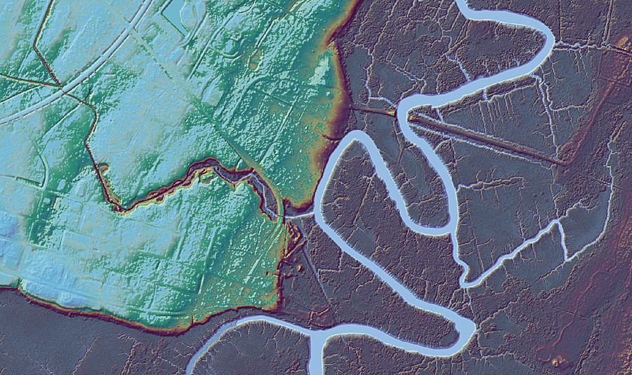 Lidar data showing the City of Darien, McIntosh County, Georgia, with one of many meandering rivers that converge on America's Eastern Seaboard.