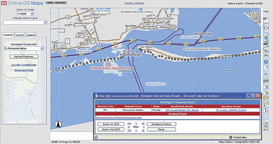 The eCoastal Online Map Viewer allows Corps engineers to select a navigation channel and view dredged channel information, including historical data.
