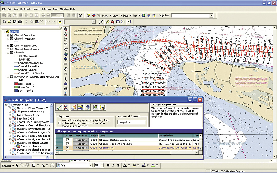 In addition to providing data models, eCoastal includes a suite of custom tools. For example, the eCoastal Datapicker tool allows a user to easily find and connect to needed data. With the ArcGIS Desktop software-based tool, users can search by keyword or category, then load data directly from their own or other Corps districts.
