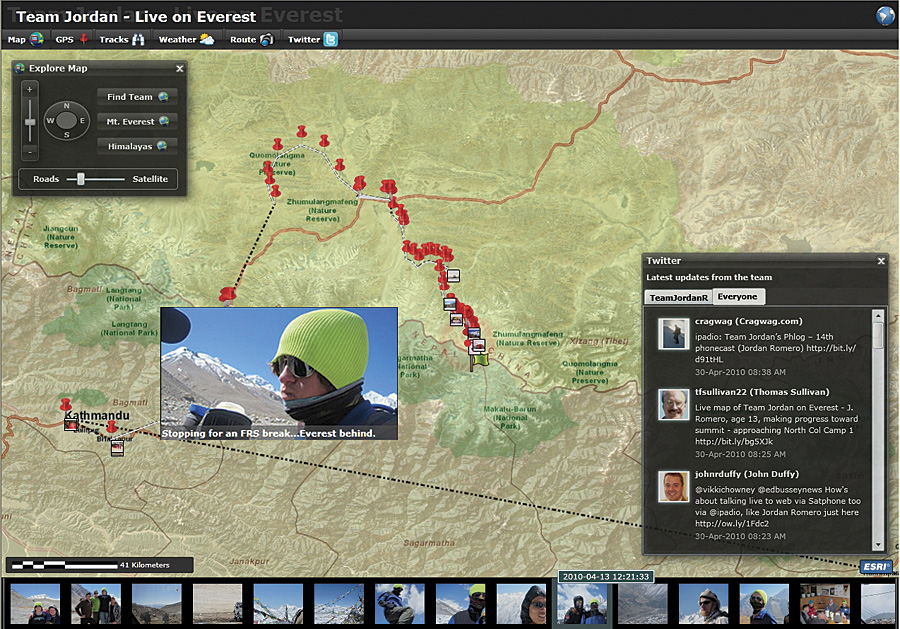 The Live on Everest application used Esri ArcGIS technology to bring various types of online information together into one simultaneous view. In addition to showing the map with nearly live tracking and Twitter exchanges, the application aggregated and displayed social media information from the team's Facebook blog and Flickr photos. Visitors at Live on Everest could access local weather forecasts, explore a terrain profile that calculated daily distance and elevation gains, and see a side view of the climbing route.