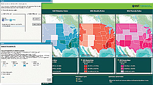 One particular example of a custom application is the new map comparison template. With this template, available only through the ArcGIS.com viewer, you can compare three ArcGIS Online maps side by side. For instance, you can look at individual maps about diabetes, obesity, and poverty rates and compare them in one view. All three maps are synchronized, so when you zoom and pan in one map, the other two maps will automatically adjust to the same scale and location. Information about the maps, such as description, content, and legend, is also synchronized to display on all three maps. When you use the Identify tool, information about features at the same location is displayed in all three maps. This provides you with a visually compelling and intuitive way to compare the different maps at the same time and gain a common understanding of several themes and the relationships between them. You also have the ability to modify the JavaScript source and adjust the look and feel of the template to meet your needs, add your own tools, and much more.