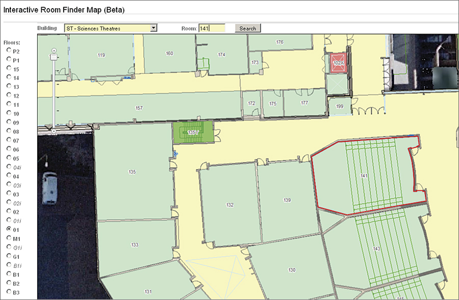 To help students and visitors easily find their way around campus, the university developed an interactive room-finder application using institutional data. Users can input the building name and room number they wish to find, and the application generates a detailed map showing the floor plan with the desired room highlighted. Visitors can look up their destination using the online tool and determine the nearest parking area before arriving on campus. This enhances visitors' experience and helps them save time.