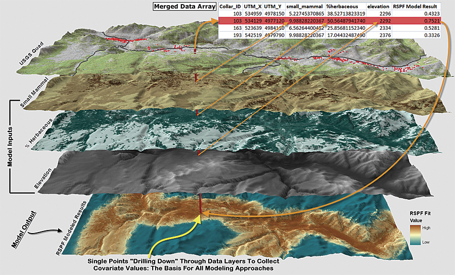 The issue assessment resulted in the creation of two narrative models, one representing birthing arenas and another for resource selection (involving the identification and use of viable habitats). In this case, species vitality could be explained by forage availability, predator intensity, geophysical context, and climatic variables. For example, the more rain, the more food, and the more newborns, the healthier the population might become.