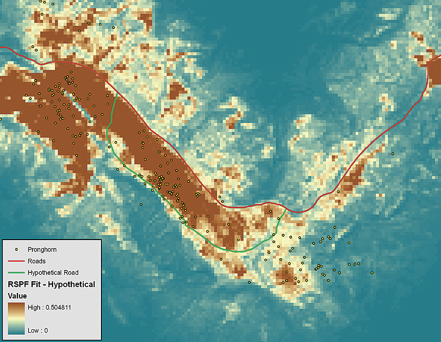 The map on the left displays a portion of the original resource (RSPF) model showing predicted habitat use for pronghorn in Yellowstone National Park. The Swap tool was used to apply the resource model to a hypothetical road addition (shown in green). The new prognostic RSPF model output for pronghorn (right map) indicates that pronghorn would be excluded from portions of their original selected habitats.