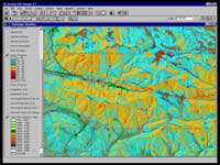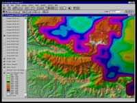 This data, containing measurements taken at five-minute intervals during the storm, was splined, sampled to 10-meter resolution, and calibrated against known rainfall samples taken during the storm. The resulting rainfall summary theme showed that the entire area received more than two inches of rain during a period of less than two hours and that most of the rain fell within a one-hour period. However, the area around the Snow Creek, Slide Creek, and Bridal Veil drainages received even more rain-three inches during this same period.