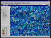 Next, a hillshade theme was created from the DEM grid using basic functionality built into the ArcView Spatial Analyst interface. A hillshade is a map showing the shadows that would be cast by the terrain given a specified sun azimuth (compass location along the horizon) and altitude (height of the sun in the sky). Choosing Surface > Compute Hillshade was all that was needed to create a black-and-white hillshade theme. The hillshade theme was merged with the existing DEM data by clicking on the Advanced button in the Legend Editor and creating a Brightness theme using the classified and color-ramped DEM theme. The result was a more realistic and interesting view of the area.