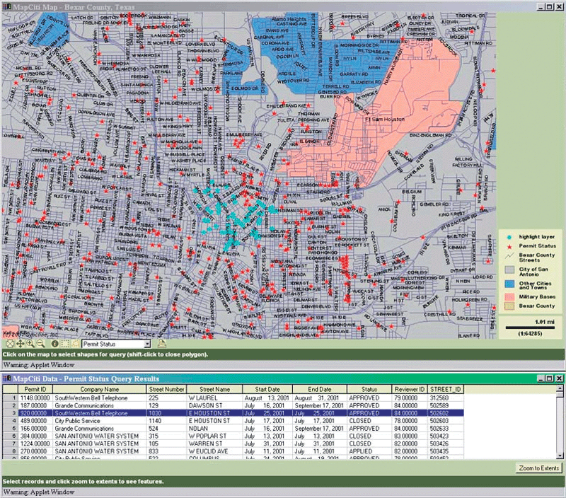 Unlike other permitting systems, the MapCiti Permit Module provides comprehensive, Web-enabled permitting functionality and is seamlessly integrated with the city's GIS. With the MapCiti Permit Module implemented, DOS officials and contractors need only a standard Web browser to access and view all street, zoning, and permit activity online using maps created through the Permit Module.