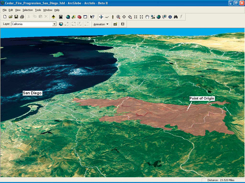 | The value of GIS was amply demonstrated during the wildfires in Southern California in October 2003. Santa Ana winds fanned several fires into major conflagrations that stretched from Ventura County to the border with Mexico. |