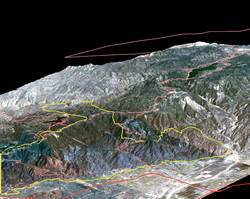| Image and vector data were combined in ArcGlobe to show the extent and effect of the fire. |