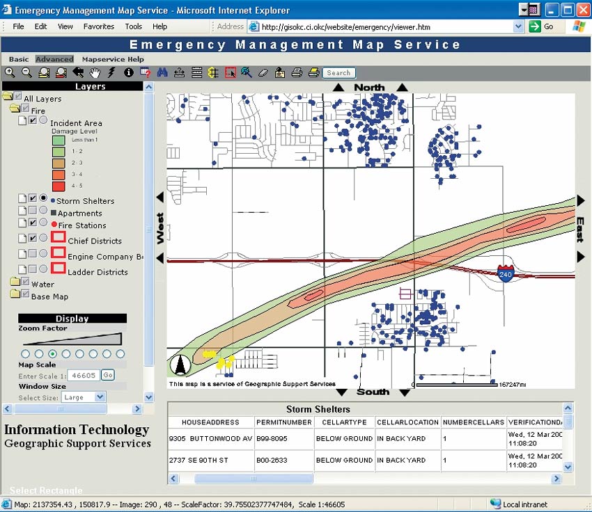 With the development of a shelter registration application, the emergency management agencies of the City of Oklahoma City, Oklahoma, are more prepared than ever to respond to severe weather conditions. In response to requests from citizens and public safety agencies, the city is using GIS to develop a private storm shelter registration program that ensures public safety agencies will have immediate access to shelter information from any location so residents trapped in shelters can be rescued. The City of Oklahoma City, Oklahoma, covers an area of 622 square miles in the middle of what is commonly referred to as "tornado alley." The frequency and intensity of tornadoes in this area is higher, on average, than other parts of the country. Since 1890, 108 tornados have passed through the city's metropolitan area according to National Weather Service reports. As the city's population continues to increase, so does the likelihood that a severe weather event will affect the property and lives of city residents. On May 3, 1999, a devastating F5 tornado passed through parts of the metropolitan area, causing a large area of damage. [The F-scale rates the damage caused by a tornado on a scale of 0 to 5. F5 tornados are the most devastating.] Emergency management agencies were stretched to the limit as a result of the extent of the damage area. The winds from this tornado were so powerful that whole neighborhoods were damaged to the point of being unrecognizable. In all, more than 6,000 homes, commercial buildings, and other structures were damaged or destroyed. Some citizens were trapped for several hours in underground storm shelters that were covered by debris. With more severe storms threatening the area during that night, rescue personnel searched through debris for trapped victims. Even though the emergency response to the disaster on May 3, 1999, was outstanding, the city realized that information must be more readily available to plan and manage emergency response operations. Additionally, emergency personnel must be able to quickly and easily access the information they need to respond. The city's GIS system was identified as a critical information resource for emergency managers and rescue personnel. The city's GIS Division of the Information Technology Department began gathering the information requested by emergency managers and developing the mechanisms to deliver the information. The city uses ArcGIS 8.3 with ArcSDE and custom ArcIMS and MapObjects applications running on Windows 2000 Server, Internet Information Services (IIS) 5.1, and Apache Tomcat 4.0.3 server software. As a result of the May 1999 tornado, the city realized that the locations of private storm shelters were needed as part of its tornado response. The city initiated a voluntary private storm shelter registration program to gather the information from citizens. A telephone hot line was established and a Web-based data entry application was developed, utilizing Microsoft's .NET technology. As storm shelter information is entered, the address is matched directly to the address feature class stored in ArcSDE. The city maintains the exact locations of more than 215,000 addresses as a feature class in ArcSDE. The storm shelter data is stored in a Microsoft SQL Server database with a foreign key to the address feature class in ArcSDE. To date, the city has recorded more than 3,000 private storm shelters. An important requirement of the program was to make the information immediately available to emergency managers and rescue personnel. To accomplish this, the storm shelter data is dynamically combined with the address feature class on the ArcSDE server as an SDE view. This storm shelter data view appears as a regular geodatabase feature class to SDE clients including ArcMap and ArcIMS. With the SDE view, the burden of joining the data is placed on the ArcSDE server rather than on the client machine. ArcSDE has proven to be very effective in serving data through SDE views. Because GIS data can be presented as database views, information can be easily served and accessed through ArcIMS browser-based applications. Users with low-end machines and no specialized software can access GIS-based information stored in ArcSDE served in an ArcIMS map service. At the request of public safety agencies, the city's GIS Division has built custom ArcIMS applications. The private storm shelter information is served through ArcIMS map services and is widely available and easily accessible. The map service contains empty datasets that are populated in the event of a tornado or other disaster. On May 8, 2003, after weeks of planning, the city conducted a public relations demonstration of the storm shelter registration hot line to local news agencies. Ironically, less than two hours after the demonstration, an F4 tornado touched down in the city limits. The approximate tornado path was immediately delineated in the GIS system, and 96 private storm shelters were identified as potentially being affected. The information was posted to the ArcIMS map services and hard copies produced for distribution. The ability to access, query, and report this information quickly is dependent on having the latest Esri technology in place. Fortunately, the tornado did not affect heavily populated areas, and no citizens were trapped in storm shelters. Although the area damaged by the May 8 tornado was less destructive, GIS information proved highly valuable for emergency responders. Over the next 24 hours, more than 120 hard-copy maps were produced and distributed. The real test for the system came the following night when a very severe storm passed through the city. However, this F3 tornado did not affect heavily populated areas. Since May 8, 500 additional storm shelters have been registered with the city through the Web site, and another 1,000 have been registered over the phone. The effort to proactively gather and make available information needed by emergency