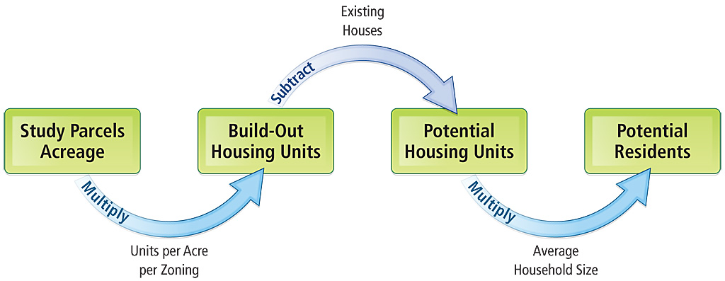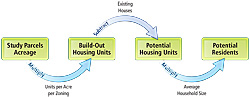 Parcels located in existing subdivisions were also removed from the study because these parcels, bigger than the subdivision's lot size, would be unlikely to be developed. Also, any golf courses and Park/Recreation/Conservation (PRC) areas in existing subdivisions were excluded. The environmental/development limitation areas were summed and clipped out from the study area using the Erase tool in the Overlay toolset of the Analysis Tools in ArcToolbox. Floodplain, wetlands, stream buffers, lakes, parks, and school properties were also excluded from the analysis. The sewer basin attribute table was joined to each study parcel using the Identify tool in the Overlay toolset. The study parcel layer dissolved by zoning category for each sewer basin using the Dissolve tool in the Generalization toolset of the Data Management tools to get the size in acres for each zoning area in each sewer basin. Calculating Potential Housing Units and ResidentsAfter calculating the acreage of the study parcels for each zoning category and sewer basin, the acreage was reduced by 15 percent to represent the amount of land typically required for infrastructure such as roads. Next, the units per acre were determined for each zoning category. Build-out housing units were calculated by multiplying units per acre for that zoning category by the acreage in each zoning category. To make the results more accurate, the number of structure address points in study parcels was calculated for each zoning category and sewer basin using the Spatial Selection tool and subtracted from the build-out housing units to generate the number of potential housing units. Finally, multiplying the average household size, based on the most recent U.S. Census data, yielded the number of potential residents. Results and Conclusion