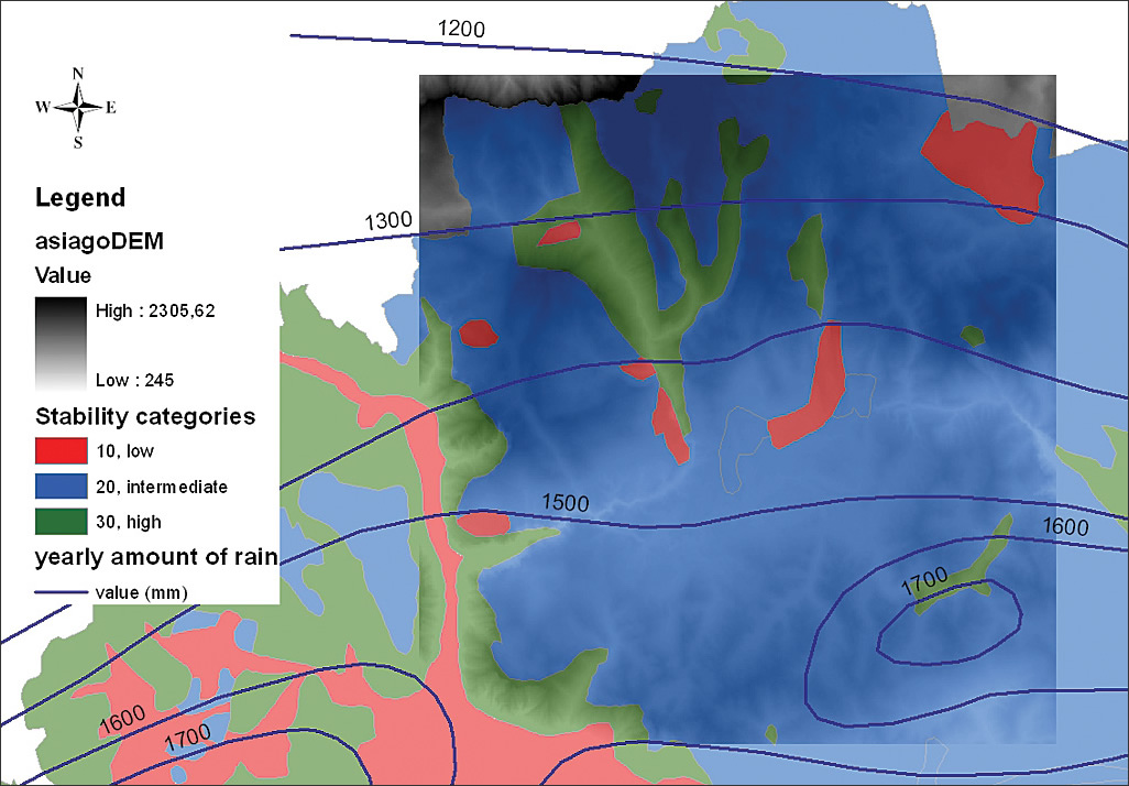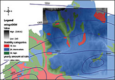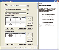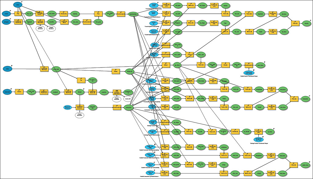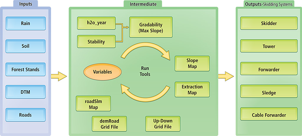 Initially, DSS applications and modeling were primarily developed to meet military needs and estimate the load bearing capacity of soils for off-road vehicles. The approaches were later applied to agriculture and forestry. Accessibility maps and analysis for planning forest operations have prevented damage to wetland soils and ecosystems. DSS models for steep Alpine areas, where forest management is concerned with wood production, hydraulic and soil protection, biodiversity conservation, and tourism, require complex analysis. For example, the density and size of remaining standing trees have a high influence on skidding operations. In addition, planning models must consider not only environmental and stand factors but also the prevention of soil compaction damage. Recent research has considered the problem of optimizing different skidding systems but did not incorporate user-friendly GIS models that could be easily shared between researchers. The Forest Operation Planning (FOpP) model defines a forest area that allows a specific skidding system can be used based on its technical capabilities and determines where that system should work to reduce operational costs and increase the value of wood. ModelBuilder was chosen to build the FopP model because it is a powerful tool for building models that does not require knowledge of any programming language. The model can be created in a step-by-step fashion. The model dialog box allows results to be checked or errors verified immediately and environment settings used to ensure all data is in the same projection. For complicated models, outputs can be stored in a geodatabase and intermediate files can be deleted at the end of the process. To simplify procedures and reduce the running time, the FOpP model was split in two parts: Defining Skidding Systems and Systems Optimization and Costs. Defining Skidding Systems creates one feasibility map for each skidding system. Systems Optimization and Costs establishes technical and economic preferences for the skidding system. Opening the model by double-clicking on its icon, ArcToolbox allows the user to set parameters and run the tools. Defining Skidding SystemsThe first step determines gradability classes using soil and rain shapefiles as inputs. The soil polygon shapefile is converted into a grid file based on soil classification (e.g., minerals and pH) and reclassified into three soil stability classes: high, normal, and low. The output file is named stability. The rain polyline shapefile is also converted to a grid file and reclassified into four classes according to the average amount of rain per month and year with assigned values between 10 and 40. Classes are defined based on average precipitation for an Alpine climate. The output file is named h2o_year.