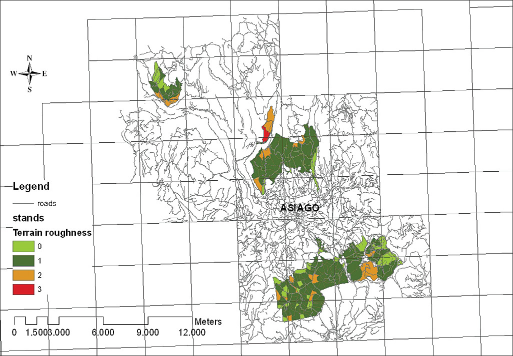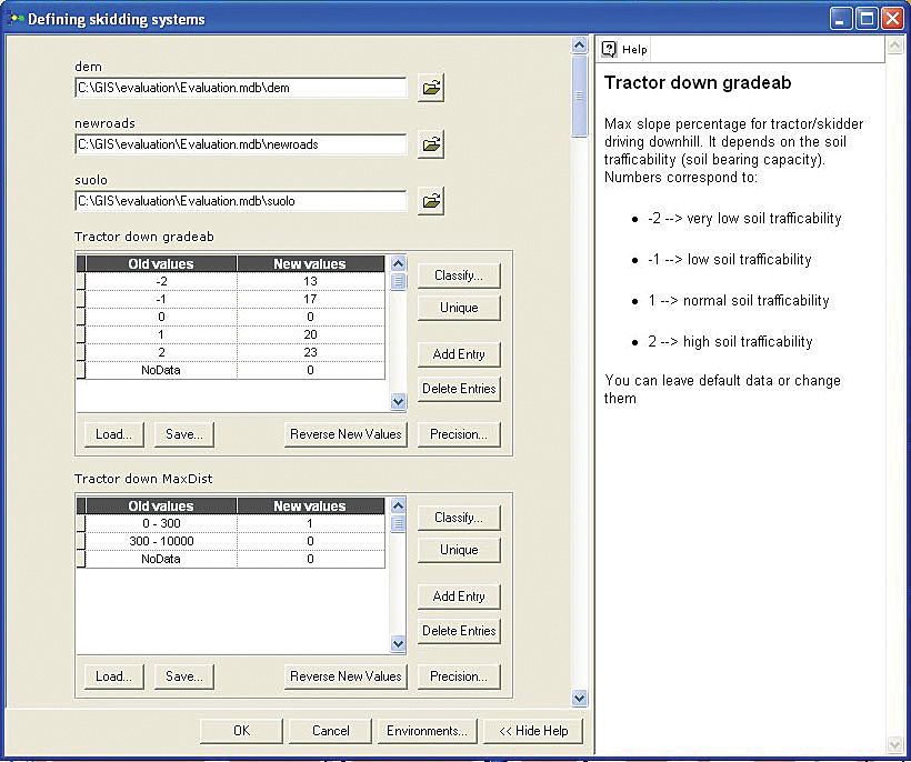 The stability and h2o_year grid files are summed using algebraic tools and reclassified into four gradability classes: high, normal, low, and very low. Using these classes, the maximum slope that will allow off-road systems to travel without slipping can be determined. Maximum slope values are set as model parameters so they can be adapted by the user via the model interface. Slope, extraction distance, and uphill or downhill skidding direction maps are then created. The slope map is created from the digital terrain model (DTM) using the Slope tool in the ArcGIS Spatial Analyst extension tools in ArcToolbox. Values are calculated as percentages. The extraction distance is generated from the roads shapefile using the Euclidean Distance tool in Spatial Analyst. Although the maximum distance may be changed by the user, the default value is 1,500 meters. The evaluation of uphill and downhill skidding direction is more complicated. Vector roads are converted to a grid file. Only truck and tractor roads are used for this analysis; skid trails are not considered. The roads grid is used as a mask to extract values from the DTM (i.e., the RoadSlm map). Using the Path Distance allocation tool, values for each road cell are spread over the area at an equal distance from other roads (i.e., the demRoad grid file). Using the map calculator, DTM values are subtracted from demRoad values to create a map with positive and negative values. The Up-Down grid file is calculated by reclassifying the values. Positive values correspond to the uphill road side (downhill skidding direction) and negative values correspond to the downhill side. The model makes a cell-by-cell evaluation for both skidding directions according to the technical limits of each machine in terms of maximum slope and distance, which are incorporated as model variables. These variables can be modified by the user for specific machines or situations.