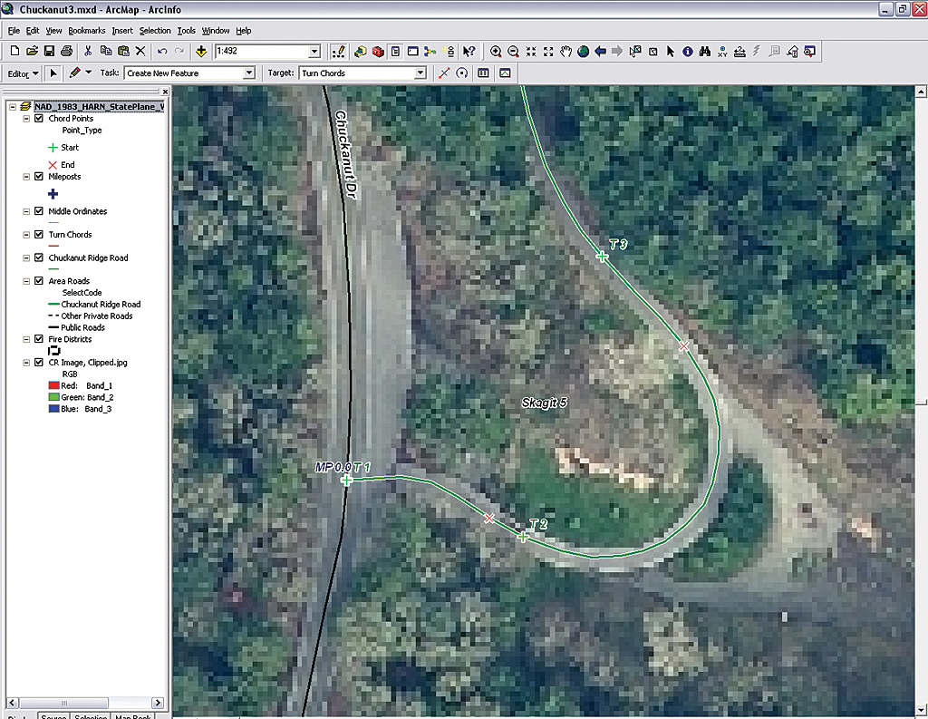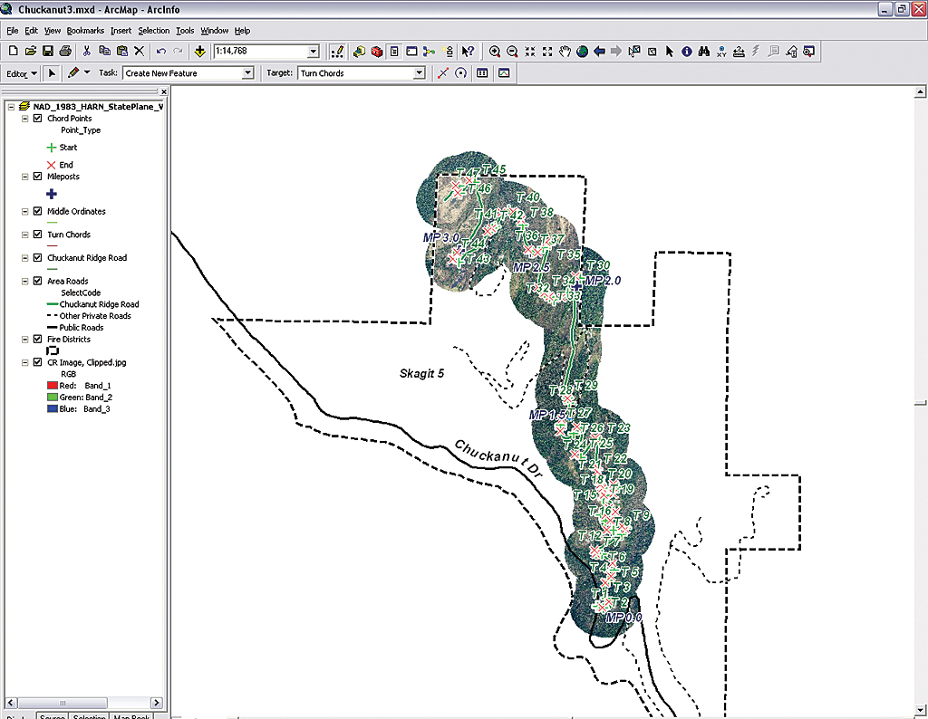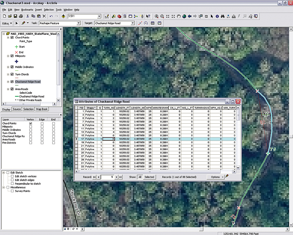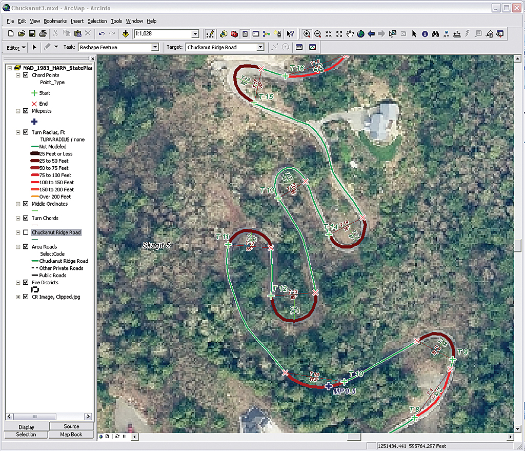 \Chuckanut \SHPFiles\WASP83NFH and load Turn Radius, Ft.lyr. Turn off the Chuckanut Ridge Road layer and check the turns. This Turn Radius, Ft.lyr uses the edited road file and applies a color legend that shows the tightest turns with thick red lines.