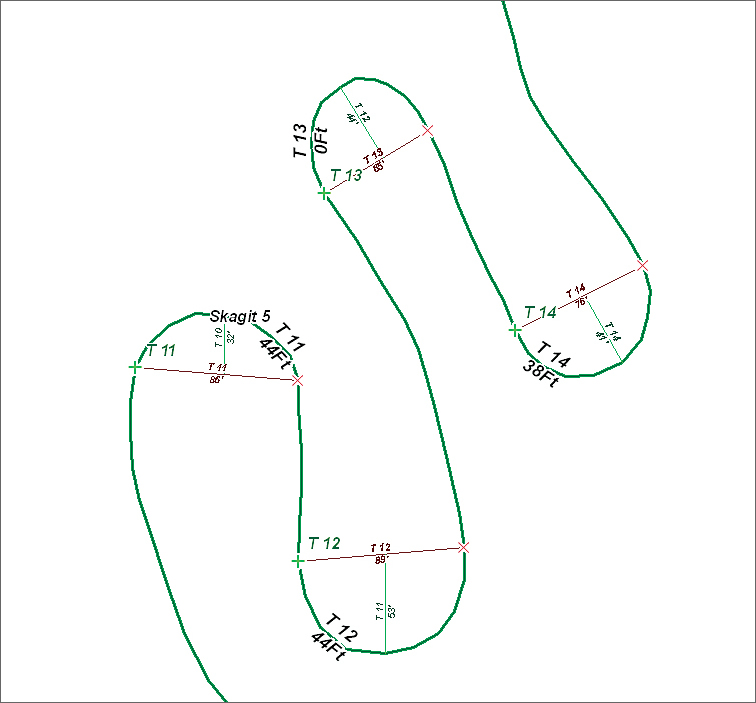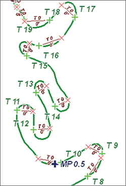 Point T1, the green crosshair located at MP 0.0. Extend the line to the next red "x" and double-click to terminate the chord. Notice that it will be immediately labeled with zero values. Continue moving up the road, building Chord 2.