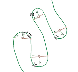 Notice that the road contains many vertices, typically spaced less than 20 feet apart. Modeling these curves requires carefully densifying the polyline. Carefully inspect the road centerline and observe how the Chord Points are placed. These Chord Points will be connected in the next section to build Turn Chords. Save the project.