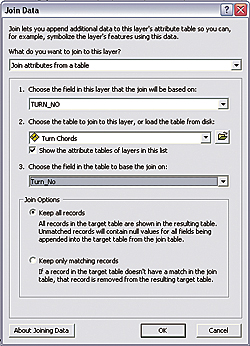 - Next, join the Chuckanut Ridge Road table to the Middle Ordinates table. Right-click on the Chuckanut Ridge Road layer, choose Joins and Relates > Join and use TURN_NO as the field in this layer to base the join on, choose Middle Ordinates as the table to join to this layer, choose Turn_No as the field in the table to join on, and click on the radio button to keep all records.