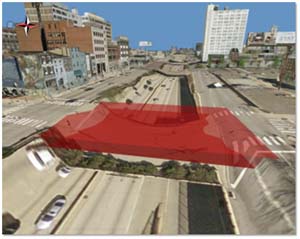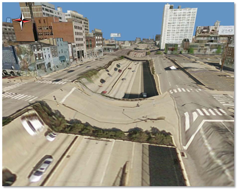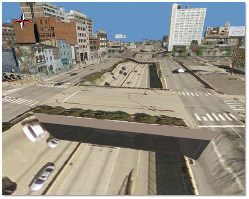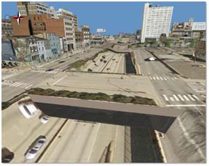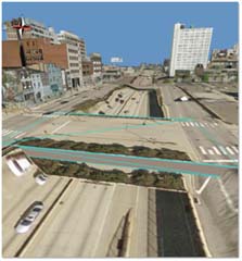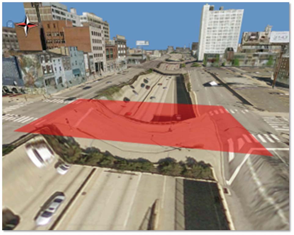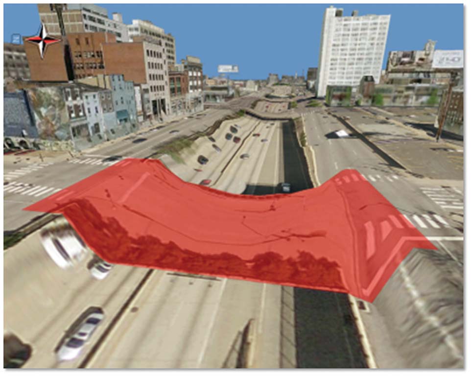 This exercise starts with an overpass feature that has been poorly captured by the existing 1-meter (m) digital elevation model (DEM) for downtown Philadelphia as shown in Figure 1. This type sampling error is commonly seen in high-resolution DEMs in urban environments that show overlapping roadways and structures of different elevations. Lower-resolution DEMs, by comparison, just make features look flat. One approach to correcting this situation might be to edit the DEM or add a patch to raise that road and create a flat surface. Although this fixes the elevation of the overpass road, it creates an impenetrable wall in the underlying expressway.
