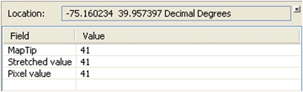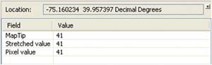 - To correctly place the elevation of the overpass once it's extruded, sample the value of the DEM on each end of the roadway (as indicated by the ovals shown in Figure 4). Use the Identify tool to sample the elevation, with 1-m DEM specified as the Identify from layer. Both sides of the overpass will have an elevation value of about 41 feet.