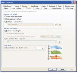 - To set the elevation of the overpass polygon, open the Layer Properties > Elevation tab and select the Floating without a surface option. Input a constant offset value for the desired elevation in the text box in the lower right side of the Layer Properties dialog box as shown in Figure 5. The DEM is 41 feet (this is pretty close to 12 meters), and this height bridges the gap well.