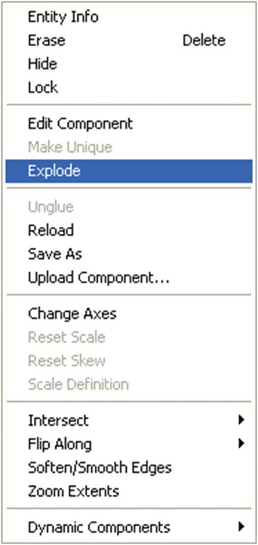 Figure 8: In SketchUp, use the Select tool to select the model, then right-click and select Explode.