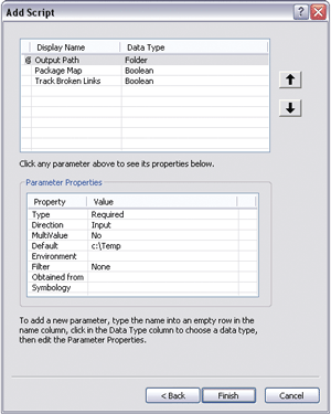 Define the properties for the script by adding three parameters (Output Path, Package Map, and Track Broken Links) using the values shown in Table 1.
