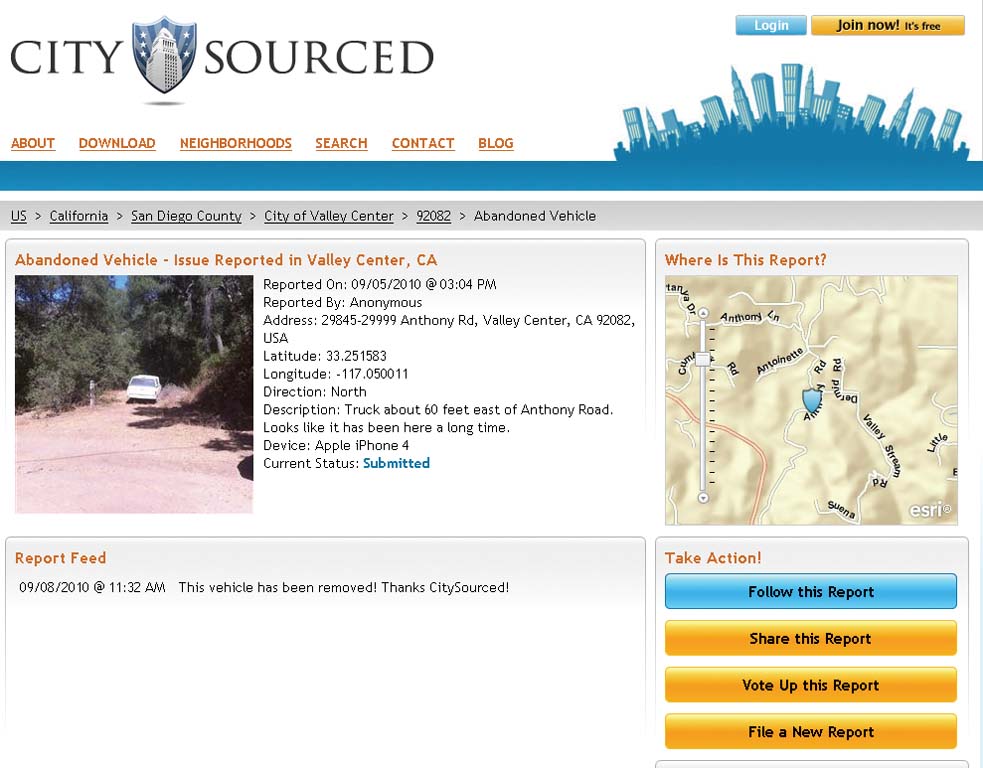 CitySourced Web site visitors can see service request reports for individual cities. This Valley Center, California, request includes the photo and status of an abandoned truck report. A variety of report types make reporting problems easy and specific. A comment field is also included for more precise reporting.