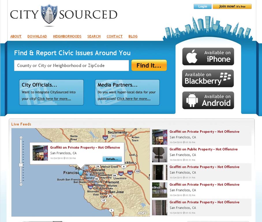 Many geospatially enabled applications and Web sites allow laypeople to record observations that appear immediately on a map or are processed and subsequently incorporated into a feature layer. Self-described as "a real-time mobile civic engagement company," CitySourced is the latest expression of this type of crowdsourced or volunteered geographic information (VGI).