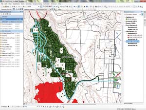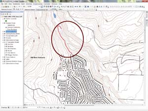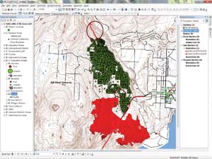 The next step will be to load the Glenrosa fire perimeter. ArcGIS 10 doesn't require placing and managing many barrier points to emulate complex geometries. Instead, restricting network travel is accomplished more simply by loading polyline and polygon barriers.