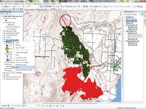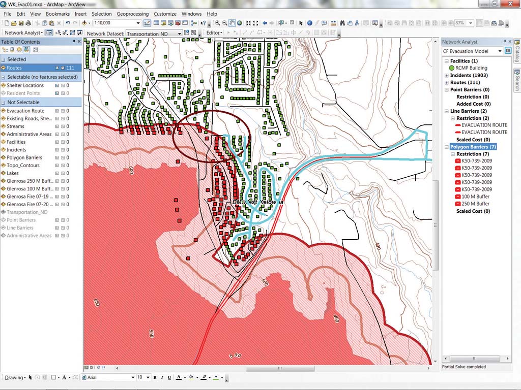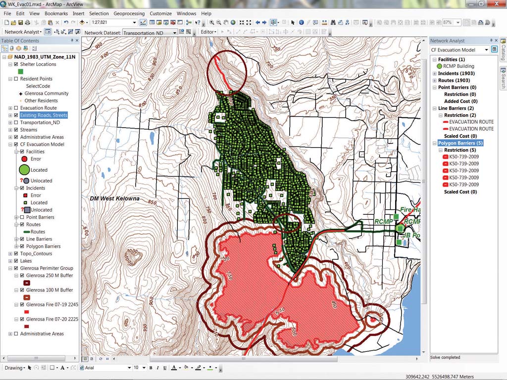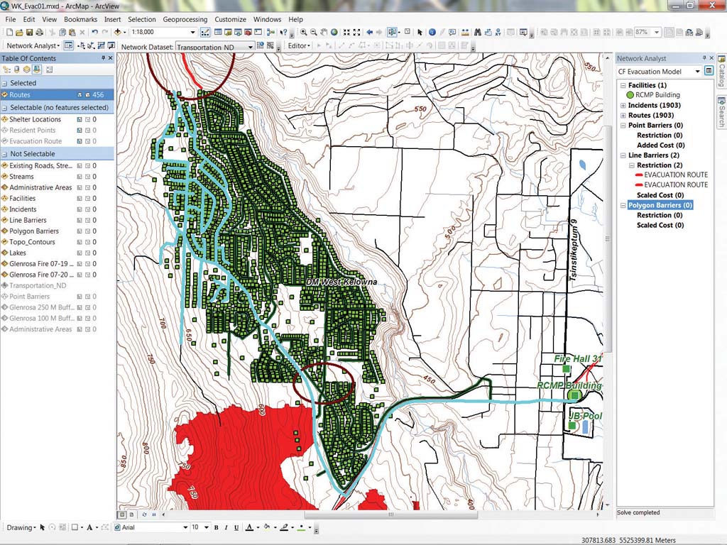 This ArcGIS 10 exercise shows how the ArcGIS Network Analyst extension can be used to identify, accumulate, and route an at-risk population from homes or workplaces to safety. This exercise walks the reader through assessing the evacuation potential of over 1,000 homes in the Glenrosa neighborhood and testing evacuation options using the actual Glenrosa/Gellatly fire footprint. Had the fire expanded only slightly, the entire community would have become cut off from safety. To respond to this scenario, the exercise will test a hypothetical "back door" that might allow evacuation of many residents directly away from the advancing fire.