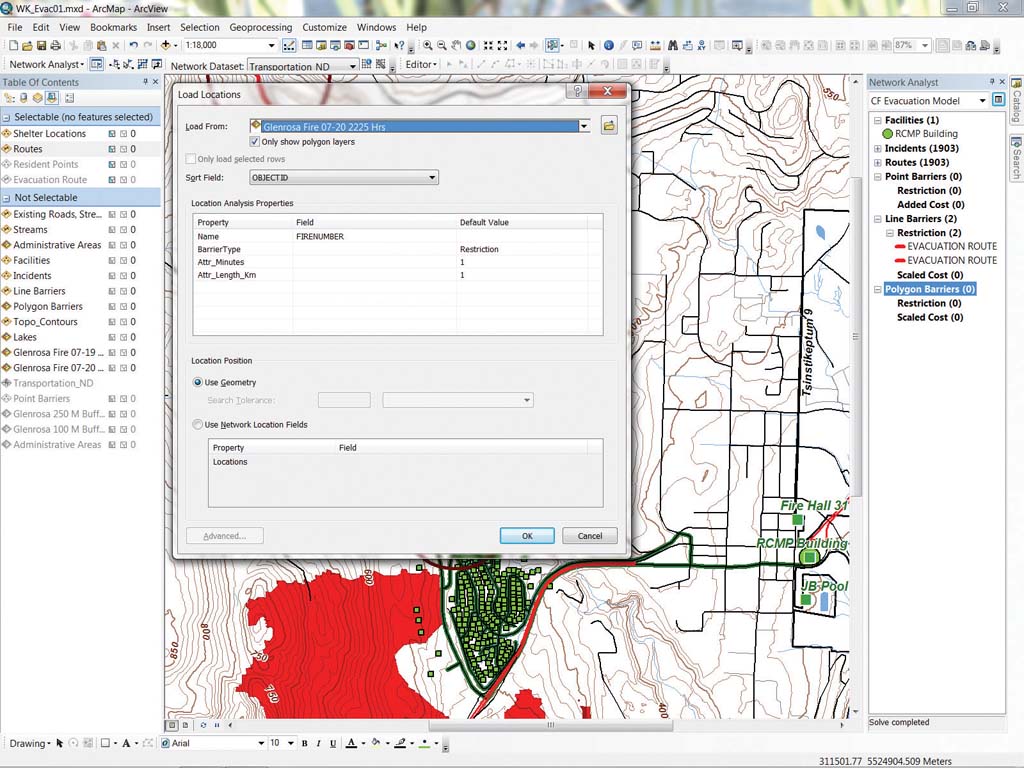 In the Network Analyst Window, right-click Polygon Barriers and choose Load Locations. Load locations from Glenrosa Fire 07-20-2225 Hours and set the Sort field to OBJECTID and the Name field to FIRENUMBER.