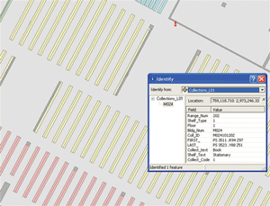 About 30 distinct features were coded for the L-SIMS geodatabase, including rooms, walls, doors, doorways, emergency exits, stacks and shelving, fire extinguishers, panic buttons, electrical outlets, computers, and Ethernet connections, as well as the collection itself—all the features that are commonly found within a library. Then several different databases related to those features were integrated into the system. This included the facilities database that identifies room numbers, room use, square footage, who is responsible for the room, occupants, and so on. The LITS database was also included. This holds information about all the computers in the library, such as the computer ID, the processor, whether it has a CD or DVD drive, and all the software on it. Also integrated is the collections database, which stores the different reference numbers and collection types for all the stacks in the library.