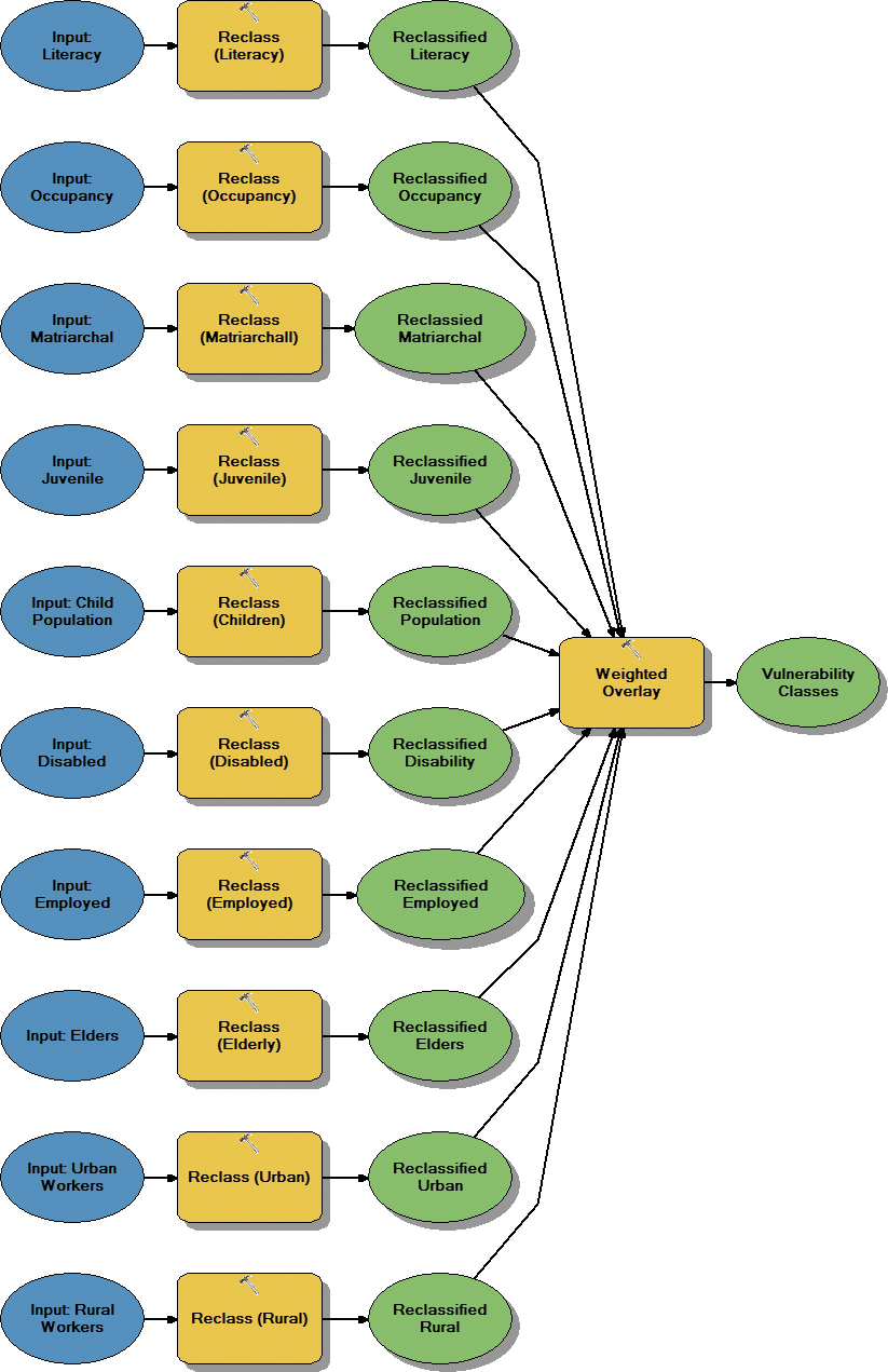 After all input variables were converted, they were added to a ModelBuilder model. First, each input variable was reclassified using a range of values from 1 to 10 to normalize the values and provide a common measurement scale. Each input variable was processed using the Weighted Overlay tool and the reclassified input variables added together to generate a social vulnerability score. Because this was a pilot project, each factor was weighted equally in developing the initial social vulnerability score. Thus, each input variable contributed 10 percent to the final social vulnerability calculation. The social vulnerability score for each region was set such that it fell into one of four classes, with class one being the least vulnerable and class four being the most vulnerable.