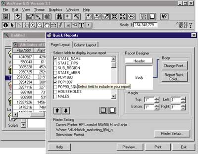 extension streamlines the process of selecting and preparing data for reports. Inside ArcView GIS, a Report Wizard allows