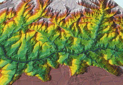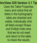 dimensions are more quickly accomplished. Draping and Modeling Two-Dimensional Data in a Three-Dimensional World Now the real fun begins, but be patient. First, open a new three-dimensional view by returning to the main Project window and selecting 3D Scenes, located at the bottom just below Scripts. Rearrange your workspace by placing the 3D legend window in the upper left corner and expand the three-dimensional view to cover most of the remaining screen. Notice the three-dimensional display area and the three-dimensional Legend are represented as two separate objects on your desktop. The three-dimensional display takes over the desktop and can be closed or pushed to the bottom of the screen. It cannot be minimized like a two-dimensional view. Study the menu selection for 3D Scene Properties. Set the Map Units to meters. Just for fun, change the background color from black to sky blue and set the Sun Azimuth to southeast. Leave the Sun Altitude and Vertical Exaggeration factor unchanged for now. Return to your two-dimensional view. Select only the TIN and if it is visible, turn it off. Use Edit Copy Themes to copy the nonvisible TIN to the Theme Clipboard. Make the 3D Scene active and paste the TIN into the Legend window. After pasting the TIN, turn it on and wait patiently (possibly several minutes) as it loads and renders. This operation tests the computing and graphics performance of your computer. If your system chokes at this point, it may be necessary to build a smaller TIN by clipping out a small portion of the topographic contour lines. If the model renders properly, experiment with navigating, panning, and zooming through the model. Use the left mouse button to navigate, the right button to zoom, and the center button (or on two-button mice, left and right buttons together) to pan. If you are not familiar with these procedures, you may want to practice on a smaller, more easily managed model. In any case, be patient. This is a large model! Next, turn off the 3D TIN and save your project with the TIN off. Return to the two-dimensional view and select the hydrography theme. Turn the hydrography theme off and copy it to Theme Clipboard. Switch back to the 3D Scene and paste hydrography into the Legend window. Turn the hydrography theme on. Make it the only active theme and use the Zoom to Active Theme(s) button. Now, use navigate, pan, and zoom to explore the streams. Don't be too disappointed if they look flat. This theme has not been assigned to any base height source. We will fix that next.