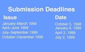 Please send digital copies of all articles either by E-mail or on diskette in the following formats: Microsoft Word 97, Microsoft Word 95, Microsoft Word 5.1 or 6.0 for the Macintosh or PC, WordPerfect 5.0 or 5.1, ASCII (text only), Rich Text Format (RTF), or other text formats. Articles submitted in the body of an E-mail are also accepted.