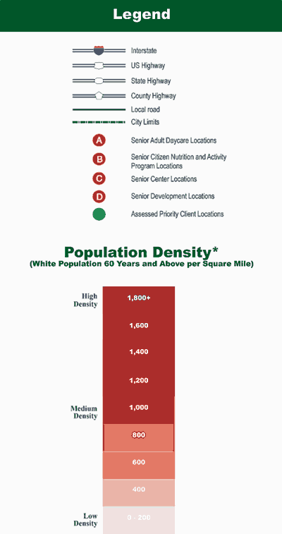In addition to better serving existing clients, the department recognizes the demand for services by people who will be enrolling in its program in the coming years. Using 2000 U.S. Census Bureau data with the ArcGIS Spatial Analyst extension, the GIS Section created density maps of the locations of potential clients by identifying areas where people aged 60 and over live.