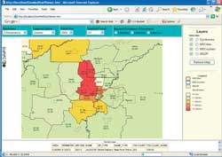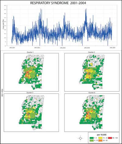 Syndromic surveillance is the utilization of crude health data for the rapid detection of disease outbreaks or bioterrorism attacks. These systems have been deployed using routinely collected laboratory, pharmacy, or clinical data such as a patient's chief complaint on arrival at an emergency department. Existing systems have focused on data collection methods, characteristics of the data collected, and analytical methods to detect disease outbreaks. Beyond actually detecting an epidemic, the availability of additional demographic informationsuch as age, sex, and locationis valuable for understanding the etiology and dynamics of an outbreak. The interpretation of such large datasets is difficult. GIS can play an important role in surveillance systems and help decision makers interpret and analyze this data. In particular, geographic information about the location of cases and their temporal evolution would be invaluable to those responsible for identifying and controlling an outbreak. The use of these systems for routine health and disease surveillance may be even more useful than monitoring for disease outbreaks or bioterrorism attacks. The authors' research focuses on implementing Web-based GIS functions into a real-time syndromic surveillance system. The system includes four major components: real-time data collection, syndrome classification, dynamic spatial mapping, and query capabilities. Query functions allow filtering of the data by syndrome and demographic variables such as age and sex. Queries can focus on particular geographic areas, such as ZIP Code or county, and permit analysis of temporal trends using user-determined dates. The Web-based nature of the system will allow anyone with access privileges to query the system for epidemiological analysis. ImplementationGeoMedStat can map the spatial distribution of infectious diseases of interest in any given time period and query disease-related information in spatial data layers. ArcIMS delivers dynamic maps and GIS data and services via the Web. For rapid application development, ArcIMS includes Designer, a component to create ArcIMS viewers using prebuilt templates. However, the ArcIMS prebuilt viewers support only limited customization capability so a customized viewer was developed using JavaScript, HTML, and DHTML to support flexible mapping functions in this system. Data SourceHealth care encounter data (i.e., data about interactions with the health care system), particularly emergency department (ED) data, is readily available and well-suited to syndromic surveillance. ED discharge diagnosis data from May 2000 to February 2005, consisting of a total of 87,350 records, was obtained from UMMC's emergency department patient database. These records were collected and used in this study. ED data is acquired using an electronic medical record in real time, and the discharge diagnoses (or ICD-9 codes) are coded automatically at the time the patient leaves the ED. ICD-9an abbreviation of the International Classification of Diseases, Ninth Revision, Clinical Modificationwas developed to allow the assignment of codes to diagnoses and procedures associated with hospital utilization in the United States. The ICD-9 codes represent ED patients' final diagnoses. One patient visit may have multiple diagnoses and associated ICD-9 codes, and each ICD-9 code in a visit was ranked in order, with the primary diagnosis first and additional diagnoses listed in rank order. The use of ICD-9 codes obviates the need to use the much less specific chief complaint data that is used in many other syndromic surveillance applications. Data elements imported from the ED database include encounter date, patient ZIP Code, city, sex, age, ICD-9 code, ICD-9 code description, and ICD-9 rank. Patient identification information is excluded. ICD-9 codes were mapped to different syndrome categories. The data could be imported from the ED database into the surveillance application at arbitrary time intervals. However, for practical reasons, in the current implementation, a time interval of 24 hours was chosen based on ED census data. Shorter intervals did not seem to offer any significant advantage. Syndrome ClassificationArchitects of the Electronic Surveillance System for the Early Notification of Community-based Epidemics (ESSENCE) system developed a mapping of ICD-9 codes to syndrome categories that has been widely distributed. The Centers for Disease Control and Prevention (CDC) identified 11 syndrome categories and the corresponding ICD-9 codes that can be used in syndromic surveillance programs. Syndromic surveillance systems have used ED chief complaints or ED discharge diagnosis data for syndrome categorization. Free-text chief complaints can be grouped into syndromes using a statistical model such as Complaint Coder (CoCo), a Bayesian classifier. Studies have shown that ICD-9 codes more accurately classify patients into syndromes than chief complaints. However, ICD-9 codes are often not available in a timely manner; therefore, many systems use chief complaint data. One GeoMedStat advantage is the rapid availability of specific ICD-9 discharge diagnoses.