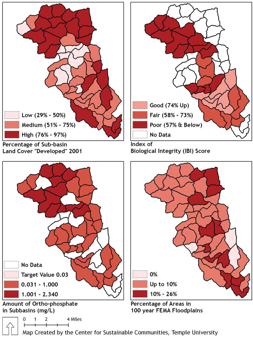 Data layers covering the physical (geology, soil, slope), biological (fish, insect populations), chemical (pollutant loads, dissolved oxygen), hydrological (rainfall, stream flow), demographic, and land-cover/land-use features were collected for the entire watershed and its 49 subbasins. Subbasins were delineated from stream line files based on stream order and topographic elevation data using the Watershed Modeling System (WMS) 7.1 and HEC-GeoRas software. [HEC-GeoRas is an ArcView 3.2 extension developed by the U.S. Army Corps of Engineers' Hydrologic Engineering Center (HEC). It prepares GIS data for import into the HEC River Analysis System (HEC-RAS) and generates GIS data from RAS output.] Natural Resources InventoryBiological data for the watershed was collected from Philadelphia Water Department monitoring stations. Data on fish species, insect habitat, and macroinvertebrates provided indicators of water quality and the suitability of the streams and riparian areas to support a wide variety of species. Sampling data was only available at 20 locations within the watershed. In ArcGIS, sampling points were assigned to associated subbasins. The spatial tools in ArcGIS allow statistical analysis of the relationships between various land-use patterns and water quality or biological integrity. An essential tenet of landscape ecology and the EPA's ReVA analysis is that landscape patterns, particularly human-influenced landscape change, affect ecological processes. The spatial analysis tools in ArcGIS, combined with freely available specialized extensions, allow for a detailed understanding of the effect of landscape change on ecological integrity and water quality.
