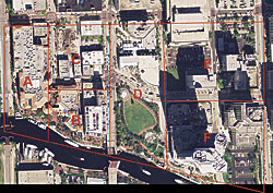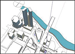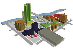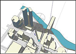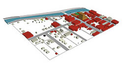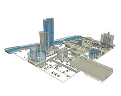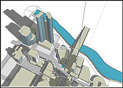 Compared with other modeling software, SketchUp's short learning curve and simple user interface provided a straightforward vehicle for three-dimensional modeling. The simple transition between two-dimensional surfaces and three-dimensional extrusions let users efficiently translate source data to three-dimensional buildings, roads, street furniture, and landscape elements. Users can rapidly develop three-dimensional models that are georeferenced, animate scenes, and produce shadow casting studies for proposed building.