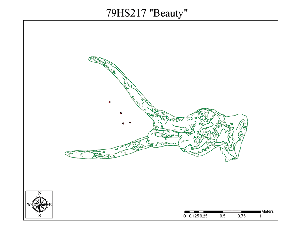 Initially, the Mammoth Site used a string grid to map the bone bed, and the cartography was entirely hand drawn. However, finding bones using one of these maps was like a treasure hunt. Most important, any quantitative analysis of a hand-drawn map also had to be done by hand. Early efforts to computerize the mapping process using CAD software and a Nikon laser transit met with mixed success. The software was not well suited to mapping, and the Nikon transit proved difficult to use in the bone bed. The resulting map permitted automated cataloging of the bone bed but was less accurate and less detailed than the old string-grid system. Enter ArcGISThe Mammoth Site recently embarked on a project to completely remap the bone bed using the latest technology. The center upgraded the GIS software to ArcGIS 9.2, bought a Trimble robotic transit, and improved site photography. These upgrades vastly improved map quality and opened the doors to hitherto impossible research. The Mammoth Site employs a complex photographic mapping process that starts with anchor points. These are actually four or more metal washers that are placed around a bone before it is mapped. Larger bones require more washers. The washers appear in each photograph, and the Trimble transit is used to shoot in the precise coordinates of each washer. Photos for Mapping and DocumentationWhile researchers use photographs to document the bones, photographs are also integral to the mapping process. Because the outline of the bone becomes part of the map, the photograph of the bone should be taken from directly above the bone on a level plane to avoid distortion.