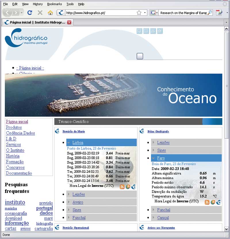 IHPT is the naval organization responsible for producing official nautical paper and electronic charts as well as conducting studies and research in marine-related disciplines such as physical oceanography, hydrography, marine geology, chemical oceanography, and navigation safety. For the last several years, IHPT has been developing an SDI called IDAMAR (an acronym in Portuguese for spatial data infrastructure for the marine environment) to support the production of technical and scientific data and information product management. It began as a departmental GIS named SIGAMAR, but the scope of the GIS was subsequently broadened, and the IDAMAR SDI now also provides the institute with the ability to respond to ad hoc requests for information from decision makers. IDAMAR SDI ArchitectureTo conform with military communications security rules, the IDAMAR SDI is actually composed of two similar systems: one connected to the Internet and one connected to a private military network. The public portion, available to all users, includes communications networks, databases, metadata, software, hardware, specialized human resources, outreach and support, data policy, internal data management processes, distributable information products, and online services. Communications networks Three communications networks support data transfer and online access to the SDI: an Internet connection, a private unclassified military network, and a private classified military network. The Internet connection supports data acquisition from several environmental sensors (e.g., wave buoys, radar stations) and the public dissemination of information products through www.hidrografico.pt. The private military networks provide access to the full system and support specific data and information requests. These networks support all internal processes for data and information product management. Databases and data models Several databases were developed using either DBMS- or file-based systems. The choice of system was based on the type of data stored and how that data could be most efficiently used. Data models for DBMS storage were internally developed for information processes except for chemical lab analysis data. A commercial laboratory information management solution, Thermo Nautilus LIMS, was acquired and extended so chemical data could be easily integrated with the entire system. Internally developed data models (when applicable) follow the S-57 standard for hydrographic data transfer. [S-57 is a digital data format standard.] The most relevant developed data model supports the hydrographic data warehouse (HDW). This database stores bathymetric soundings acquired by the IHPT and represents a major improvement in the cartographic production process because it reduces production time, eliminates procedures susceptible to human error, and improves the quality of the final product. Data stored includes data about the sea state (e.g., wave height, wave period, wave direction, and sea temperature) from ocean buoys; tide predictions and observations, horizontal control points; nautical chart and cell coverage; chemical analysis of seawater and sea bottom sediments; bathymetric navigation warnings; and medium-resolution satellite imagery. Not all data was supplied by IHPTsome data is related to activities of the Portuguese Navy. Data policy A data policy document sets out rules that govern data management and access in the IDAMAR SDI. This document stipulates policies for data classification, data access (both format and eligibility), and the associated costs. Some datasets are freely available to the public: near real-time sea state data; water temperature; sea state predictions for locations in the Atlantic and near Portugal; tide predictions for all principal and secondary ports in Portugal as well as locations such as Angola, Cape Verde, Guinea-Bissau, and Mozambique; some maritime administrative limits; small-scale bathymetric lines; and a small-scale converted Electronic Navigation Chart (ENC) cell for continental Portugal and the Madeira and Azores archipelagos. Metadata Metadata fact sheets are essential for inventorying, locating, and assessing the quality of geospatial data. These documents, which contain information about why, when, and where data was originally collected, are valuable from both a scientific and economic standpoint because they enable data reuse. Metadata is produced for all data, products, and services provided by the IDAMAR SDI. In accordance with the Infrastructure for Spatial Information in Europe (INSPIRE), metadata complies with the ISO 19115 standard. The metadata search engine was created to aid public access to the data. Specialized human resources Expertise in systems analysis, database systems administration, GIS, and Web programming was required for this project. Most contributors to the project have backgrounds in geography or earth sciences as well as master's degrees in various information technologies. This staff has developed the SDI and worked on ad hoc projects. Outreach