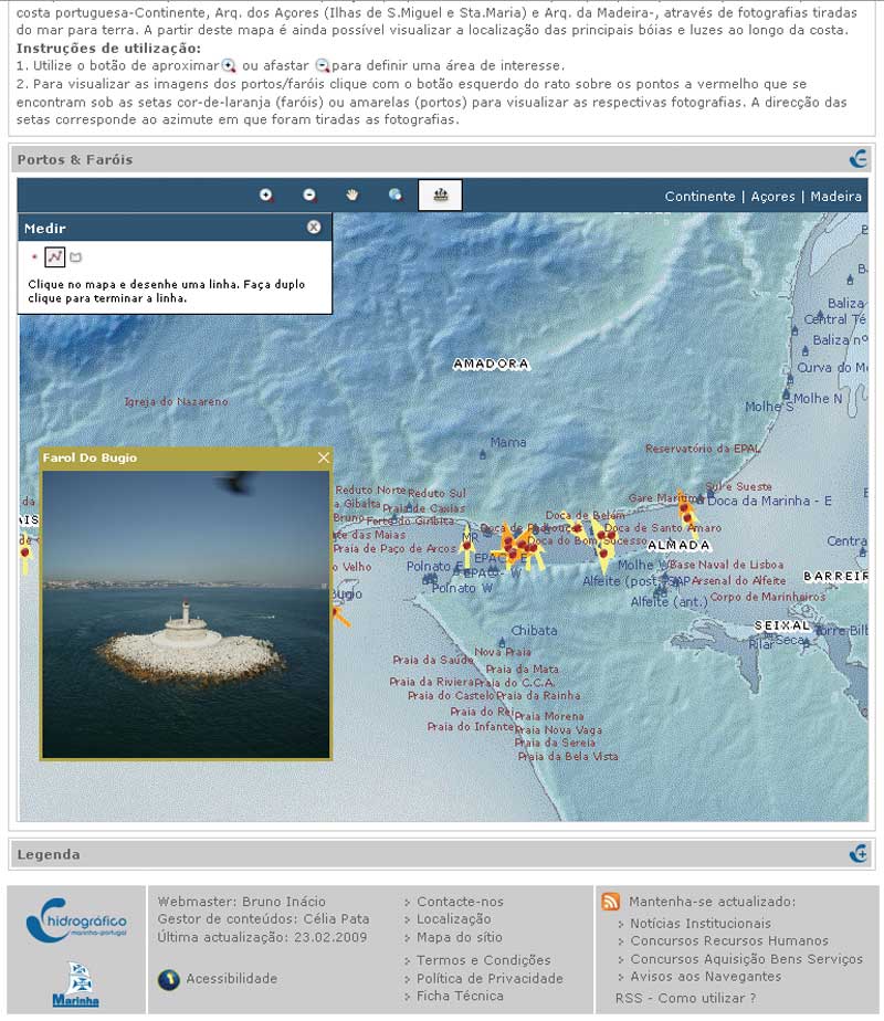 Because some geospatial analysis tasks should only be performed by scientists, courses that range from three to five days were developed to introduce scientists to GIS concepts and software. These courses are tailored to the needs of scientists and help spread GIS knowledge throughout the organization's scientific community while also providing tools that enable scientists to use GIS independently. This has allowed the organization's specialized staff time to work on both the SDI and advanced information projects. Software The IDAMAR SDI relies on Microsoft for its operating system, Oracle for DBMS, and Esri's ArcGIS for its GIS software. Specifically, the IDAMAR SDI makes use of ArcSDE, ArcIMS, and ArcGIS Server applications as well as single use and floating licenses for ArcView; ArcEditor; and the ArcGIS Spatial Analyst, ArcGIS 3D Analyst, ArcGIS Publisher, and ArcGIS Geostatistical Analyst extensions. Hardware The SDI is supported by four serverstwo internal and two external. A variety of IHPT devices (PDAs, laptops, PCs, workstations, printers, plotters, and high-resolution scanners) are used for some SDI functions. Internal processes Implementing the SDI reengineered some IHPT production processes and introduced new ones. Setting up rules and workflows was necessary because making internal production more efficient was a main objective of the project. Offline products Generated in response to ad hoc requests for information, offline products are normally distributed as CDs or DVDs. Although not necessarily related to the internal products generated by IHPT, the SDI answers specific information needs, and offline operations are advantageous from a naval security standpoint. In addition, some paper products are still used for a variety of purposes including thematic cartography. In the last three years, more than 30 ad hoc GIS projects based on the SDI have been developed. Online products and services Online products and services provide broad access to the SDI. They are the most visible part of the public system that includes data catalogs, information products, and data services. Two Web portals (one internal and one external) allow users to obtain information products and services and provide the front end for data catalogs, data visualization applications, the metadata search engine, download services, and data services. Information ProductsSome information products are available from one or both of the Web portals, while others are furnished offline. The scope of products supplied depends on use and encompasses public services, commercial services, environmental protection, naval missions, and research and development. The list of products included here is not exhaustive, only representative. Exploring data with online data catalogs, data visualization, and metadata Several data catalogs allow users to explore data in IDAMAR SDI databases. Geographic interfaces assist in visualizing data such as horizontal control points, chart folios coverage, hydrographic surveys coverage, hydrographic soundings, sea bottom sediment samples, chemical analysis for water and sea bottom samples, tide observations, and sea state buoy observations. The ENC World Catalog is one of the most relevant catalogs available. Although not entirely related to IHPT (because its geographic extent is the world), this catalog helps sea navigators identify the available cells relevant to their route. The coverage data, collected by the International Centre for ENCs (IC-ENC), is available at websig.hidrografico.pt/website/icenc and is updated monthly.